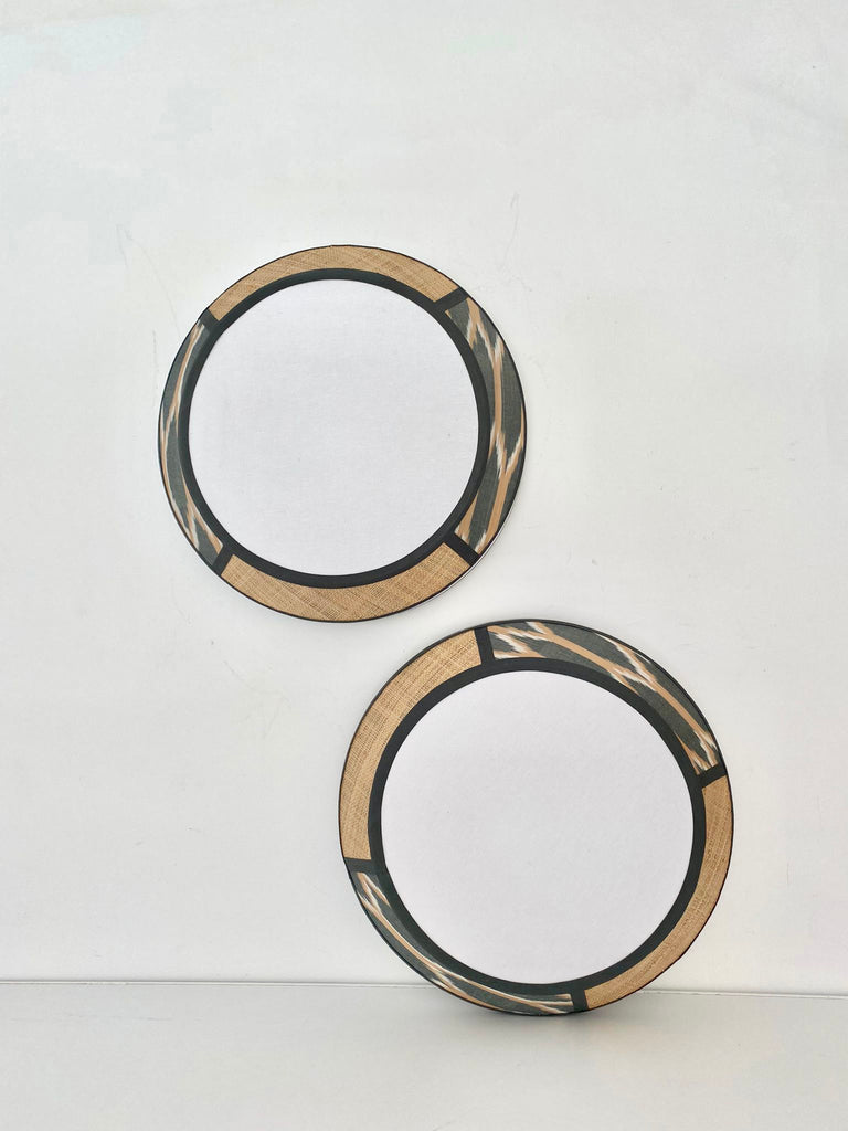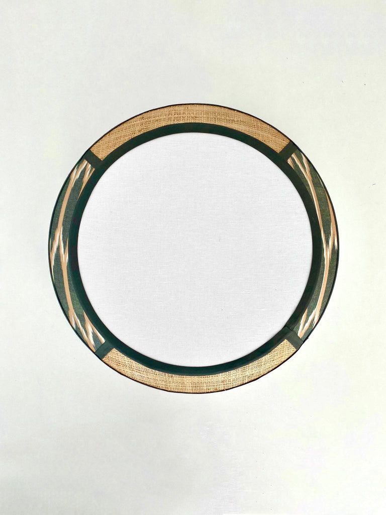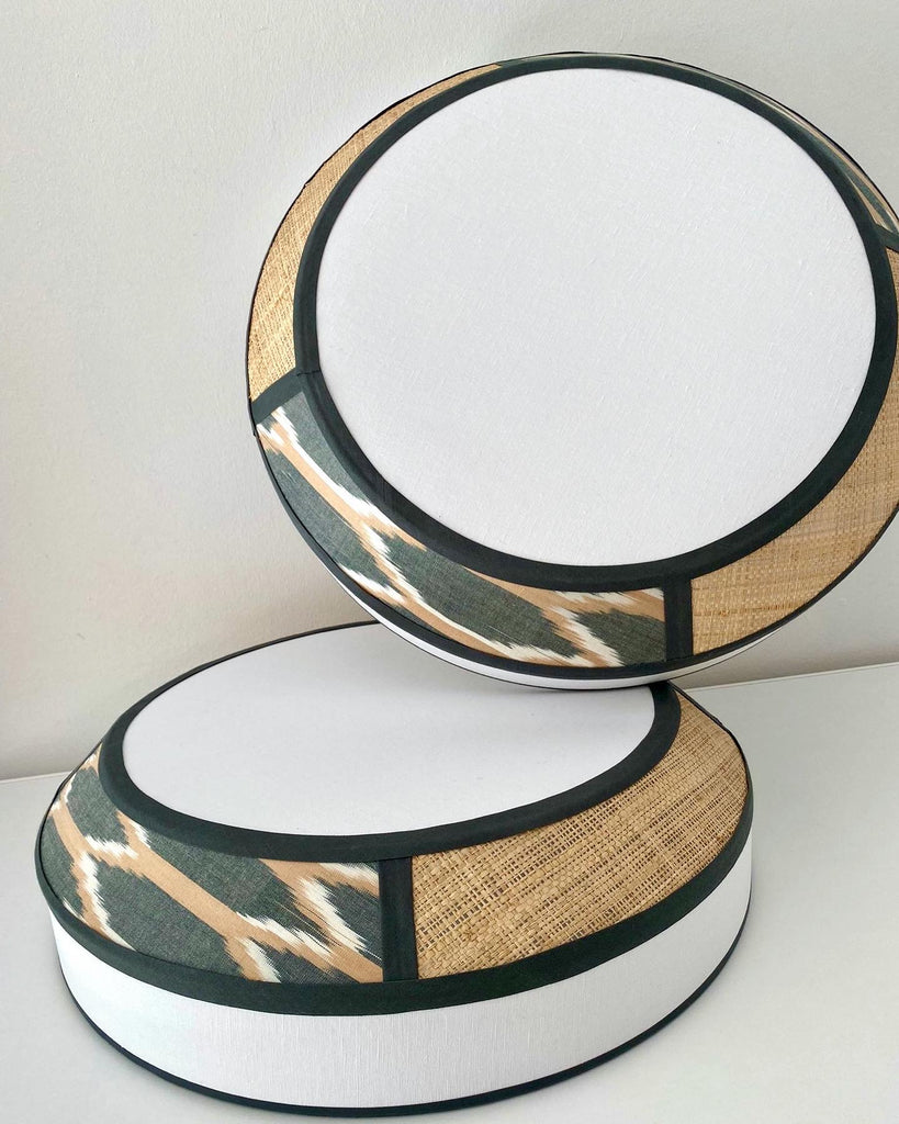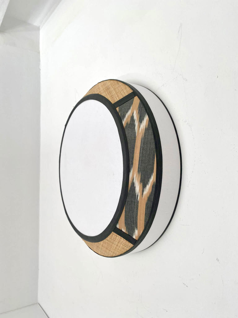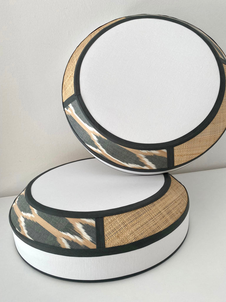El aplique o plafón de montaje empotrado puede quedar colgado del techo o de la pared. De lino con perfil de algodón y rafia natural. Incluida la electrificación para tres bombillas.