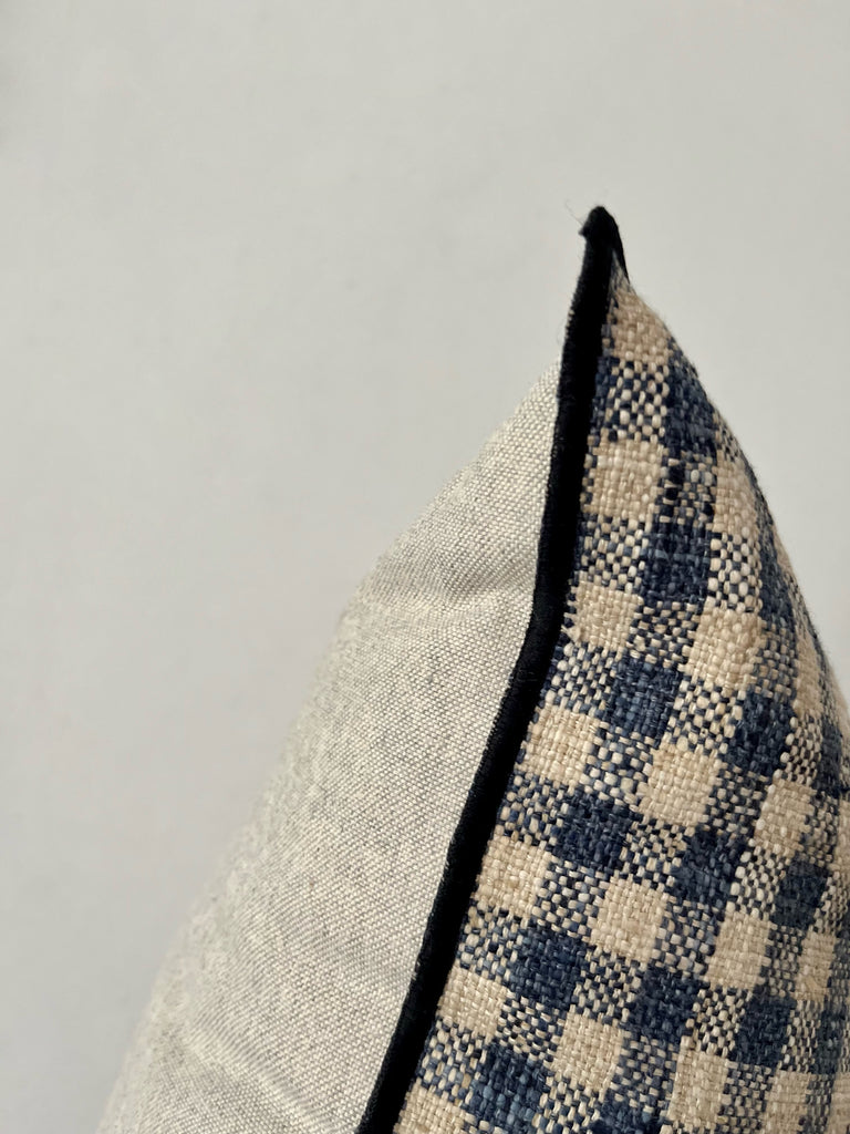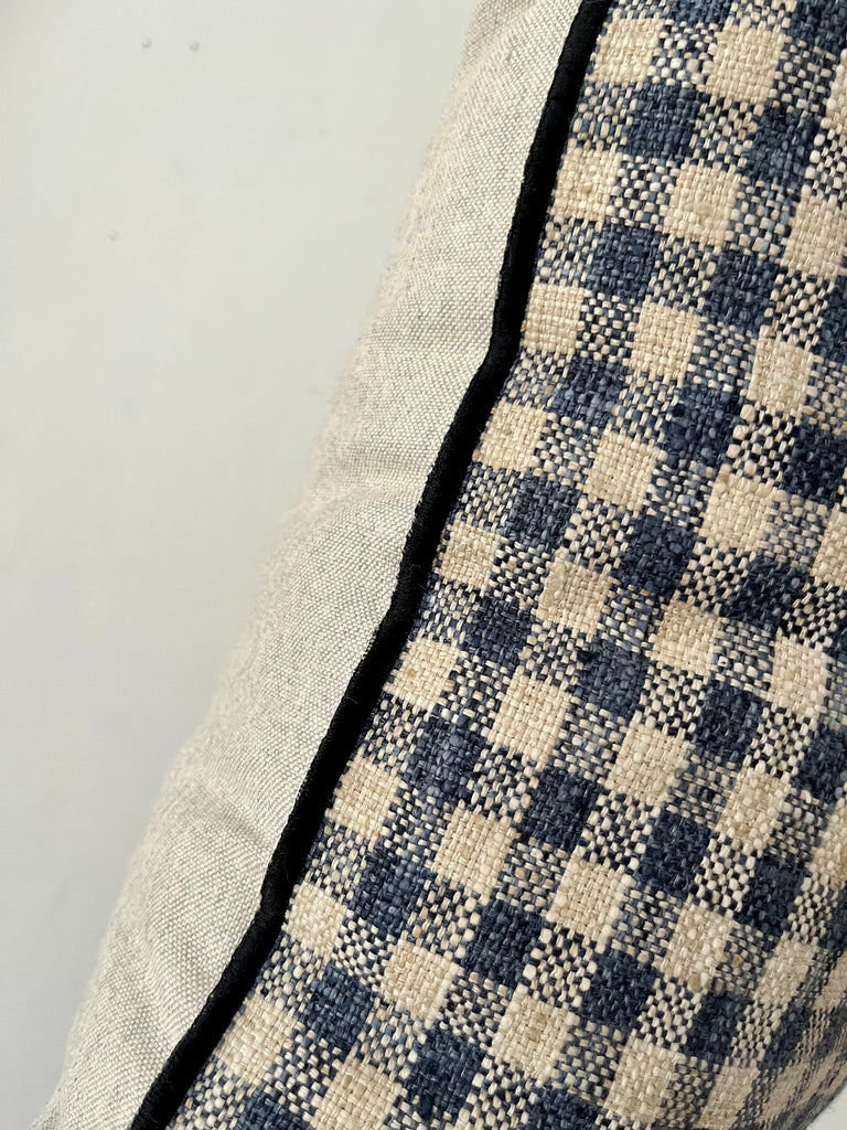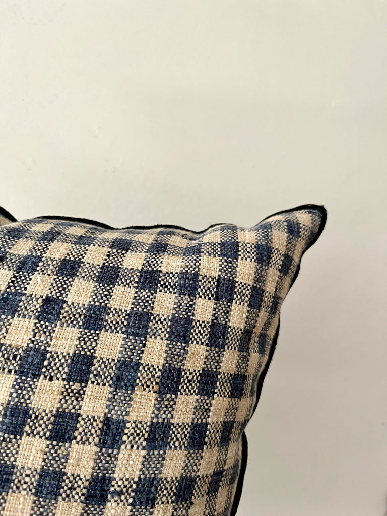 Almohadón de lino de cuadros azul, remallado en negro, relleno incluido.