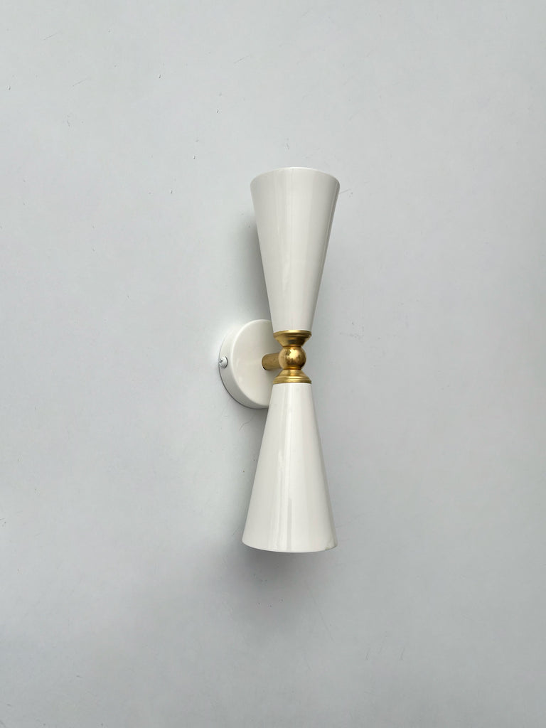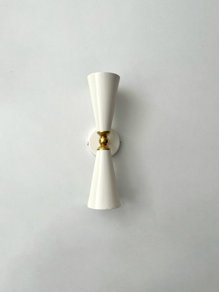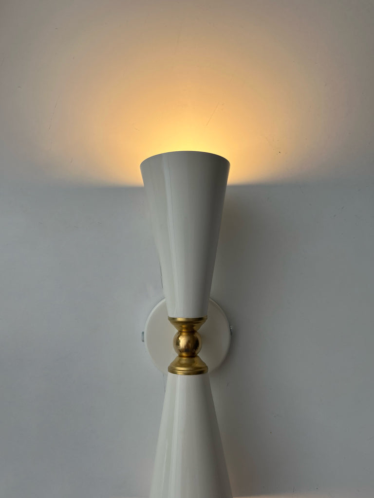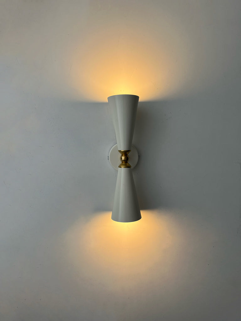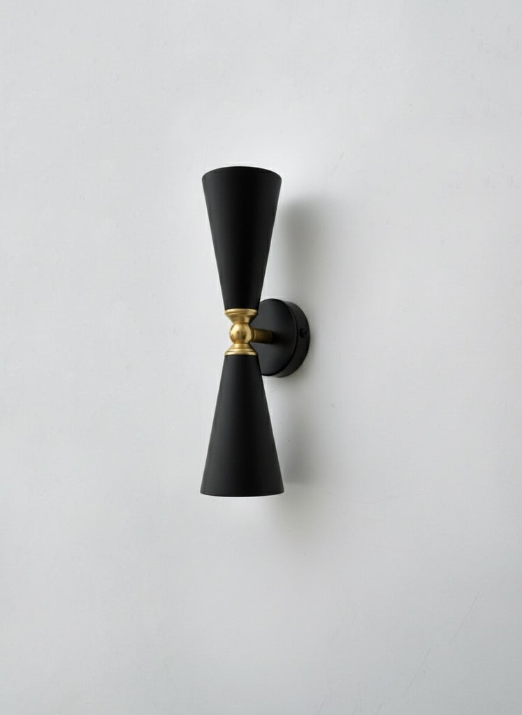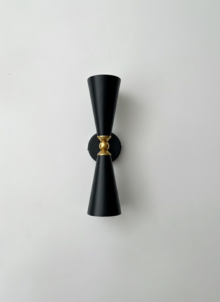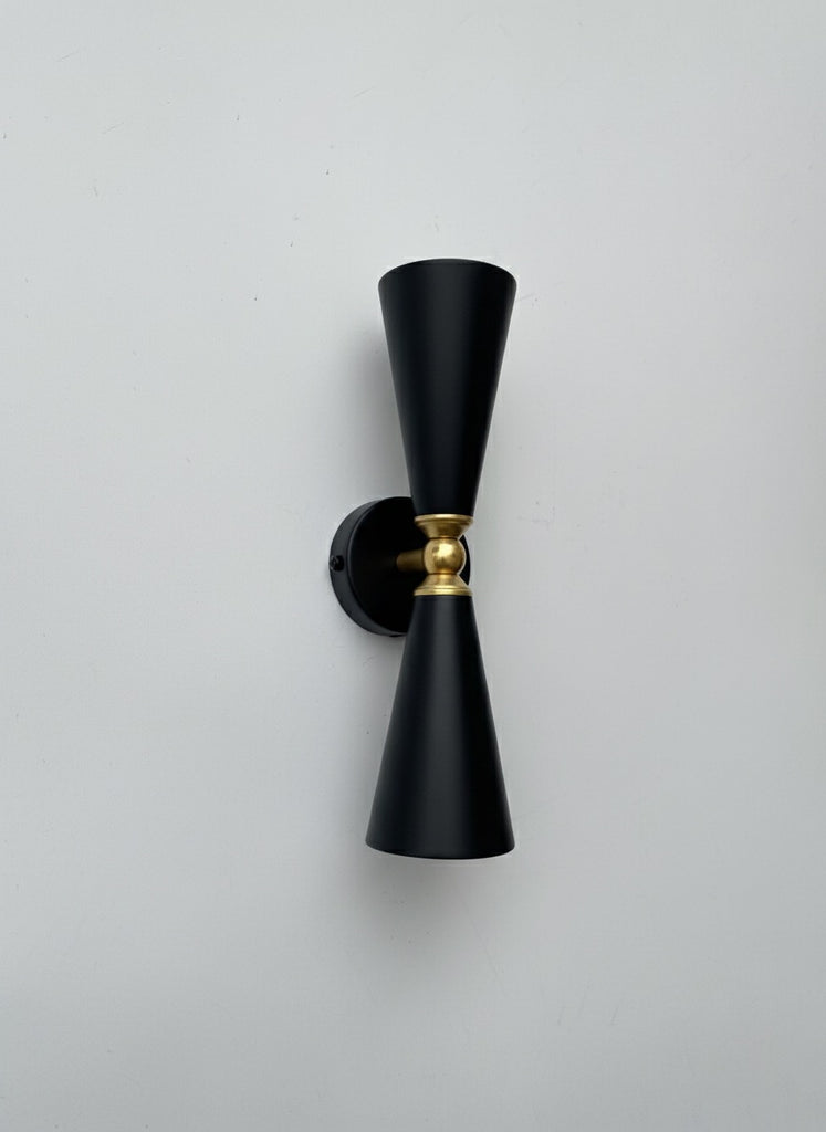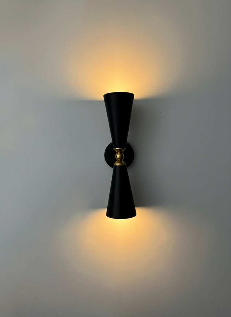 Aplique de hierro lacado y latón. El montaje puede ser colgado del techo o de la pared con orientación horizontal o vertical. Luz hacia arriba y hacia abjo.
