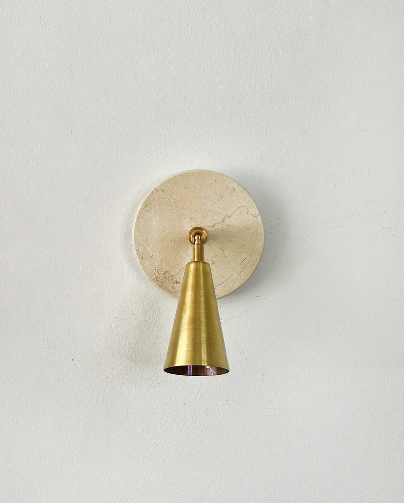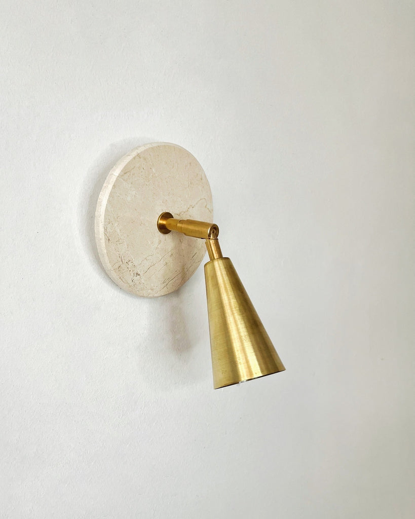 Aplique orientable de montaje empotrado con base de mármol y campana de latón en bruto, con rótula que permite movimiento.