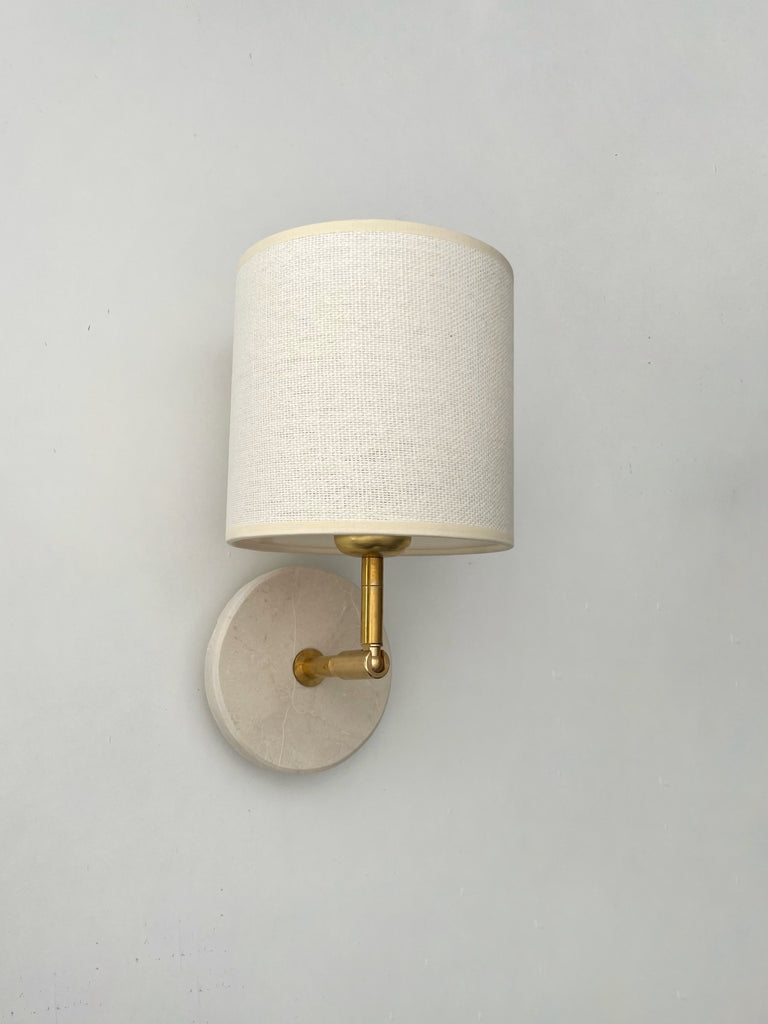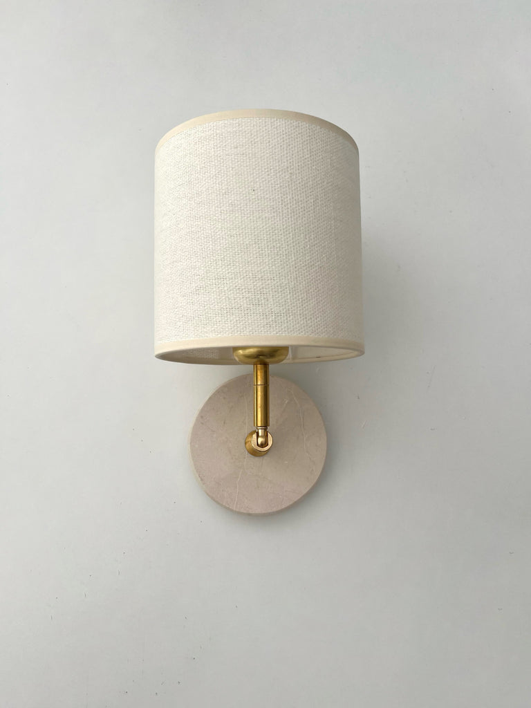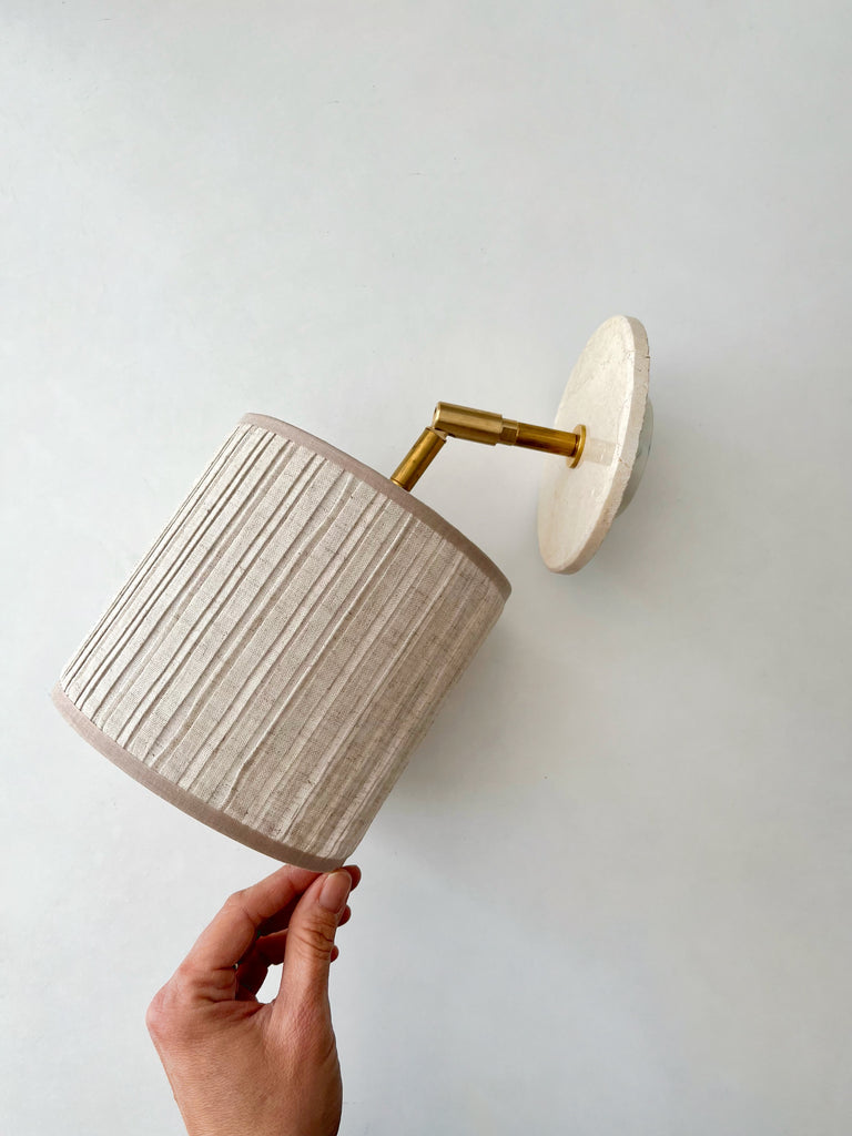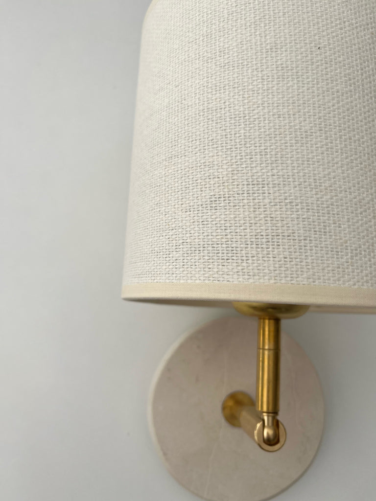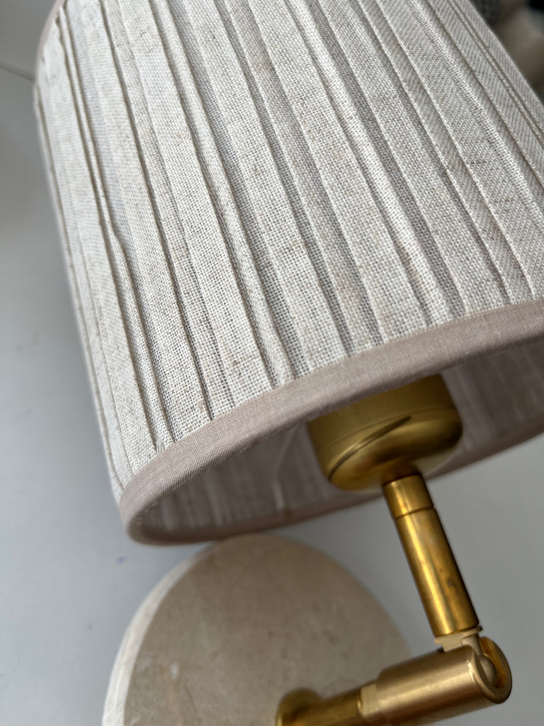 Aplique de marmol y latón de montaje empotrado puede ser colgado del techo o de la pared con orientación horizontal o vertical. La pantalla esta incluida, tienes la opción de lino natural o plisada beige.