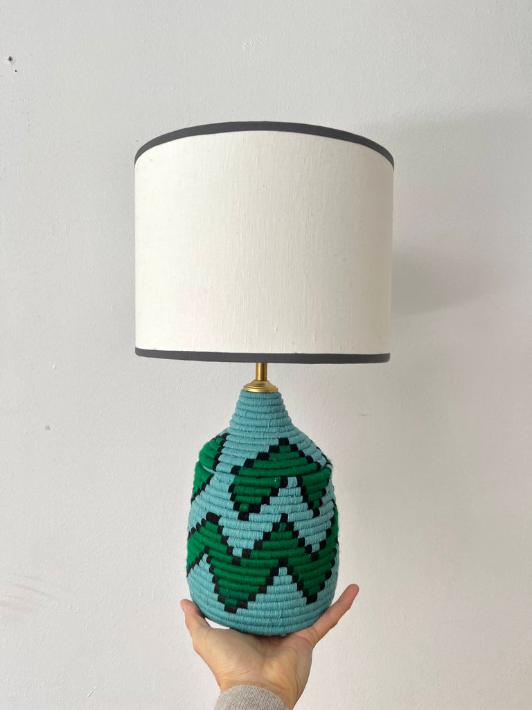 Pie de lámpara de fibra natural y algodón confeccionadas a mano. Cada una es única, pueden presentar irregularidades que son consecuencia del trabajo artesanal.